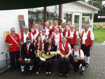 Doch die Pause war kurz, denn nun gings direkt zur Aufstellung des Rosenkorsos, an dem wir als Musikzug mitwirkten. Ca. 30.000 Besucher füllten die Strassen des Rosendorfes Steinfurt. Die Stimmung war super, das Wetter auch, ... bis kurz vor dem Schluss des Festzuges. Denn auf einmal öffnete der Himmel seine Pforten und gefühlte 50 L /m² in 10 min ergossen sich auf uns und unsere Instrumente. Doch die Rettung nahte. Der Zug kam dem Ziel entgegen und wir retteten uns völlig durchnässt an den Bierwagen des Steinfurter Sportvereins und fügten uns demüthg unserem Schicksal. Der Aufforderung unseres Trompeters Jochen wollten unsere Gööööörltz nicht folge leisten. Hätte er doch so gerne Miss Wet-Musikzug-Shirt gekührt.