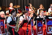 Dirndls und Trachten im Hessenstil gekleideten Musikerinnen und Musiker in den
